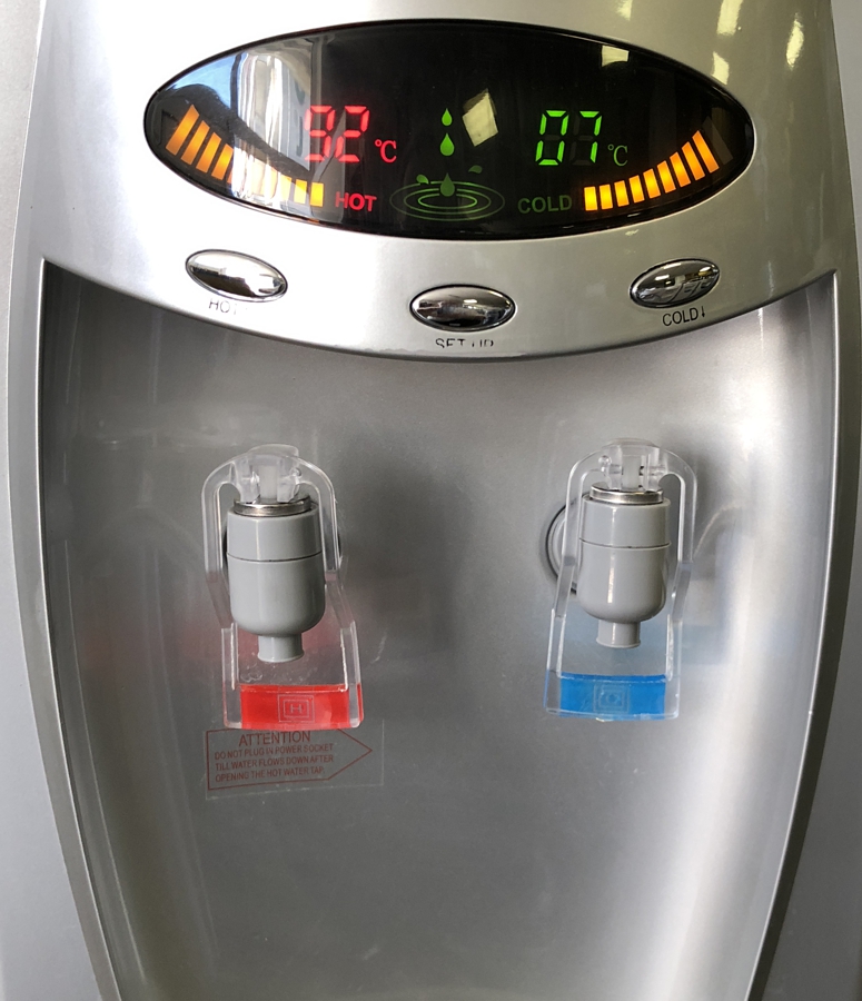 Vysoký podlahový výdejník ve stříbrné barvě na studenou a horkou vodu vybavený programovatelným elektronickým displejem, který ukazuje teplotu studené a horké vody. Boky přístroje jsou ze stříbrného plechu a přední část ze stříbrného plastu. Na digitálním displeji lze vypnout či zapnout ohřev a chlazení, takže je možnost při vypnutí ohřevu čerpat z červeného kohoutku vodu nechlazenou a používat výdejník k výdeji vody chlazené a nechlazené (pokojová teplota). Je určený k postavení na zem. Uživatel má možnost si dle svého uvážení naprogramovat jak teplotu studené, tak teplotu horké vody.