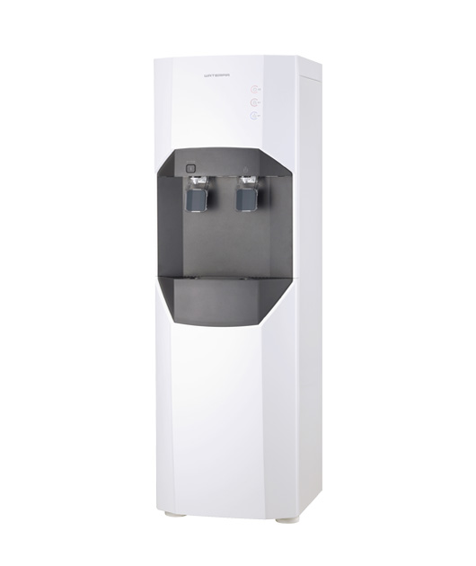 Vysoký moderní nejvýkonější podlahový výdejník v černém provedení na studenou a horkou vodu určený k postavení na zem. Tento výdejník má největší objemy nádob jak na teplou tak na studenou vodu a dokáže tak uspokojit velké množství zákazníků nebo zaměstnanců. Na zadní straně výdejníku se samostatně vypíná či zapíná ohřev a chlazení, takže je možnost při vypnutí ohřevu čerpat z červeného kohoutku vodu nechlazenou a používat výdejník k výdeji vody chlazené a nechlazené (pokojová teplota).
